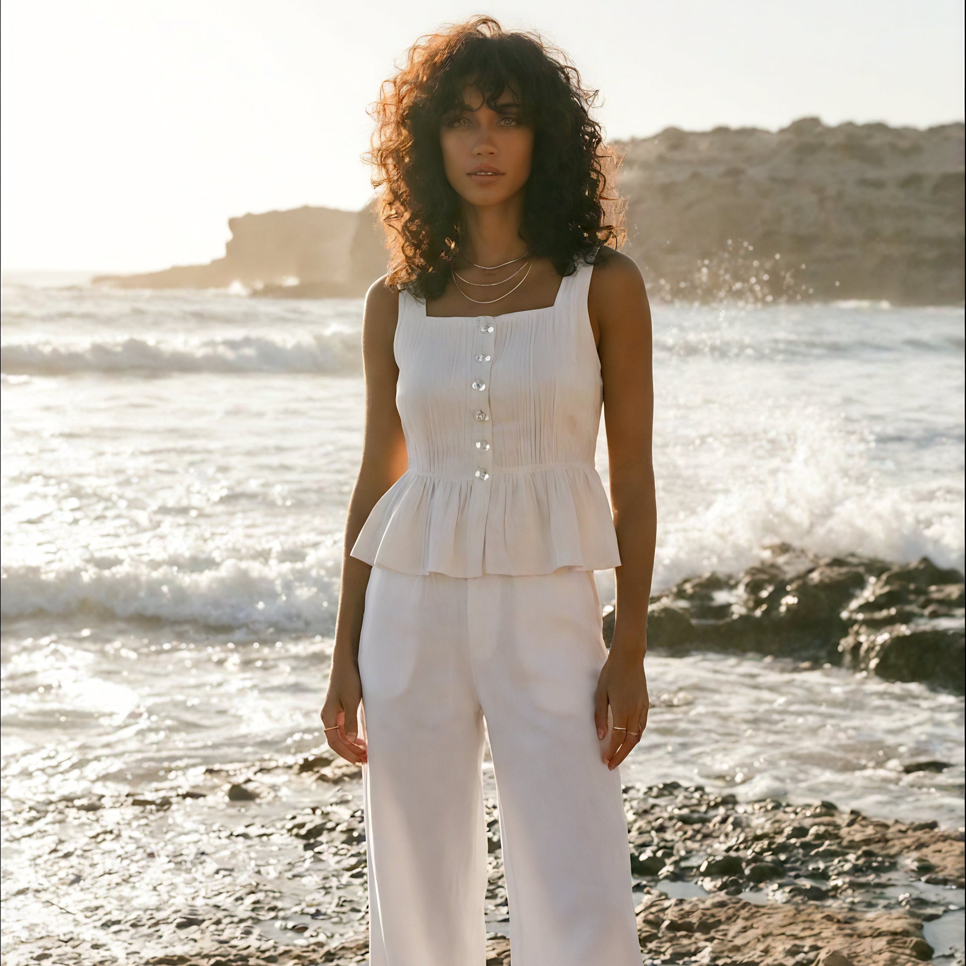 The Elodie Top is designed for warm days and effortless wear. Featuring a soft square neckline, button-through front, and a gentle peplum hem, it offers a flattering silhouette without feeling restrictive.