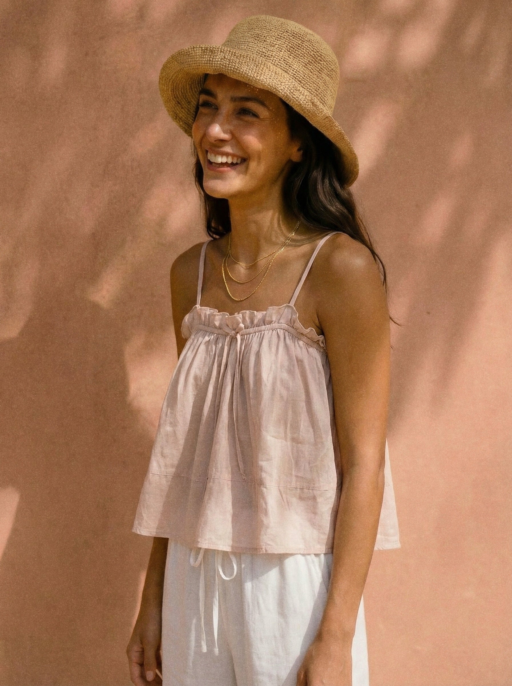 Featuring delicate straps, a softly gathered neckline, and a relaxed silhouette, Freya falls effortlessly for a flattering, airy fit. Wear it loose over linen trousers, tucked into denim, or layered under a light knit when the sun dips.