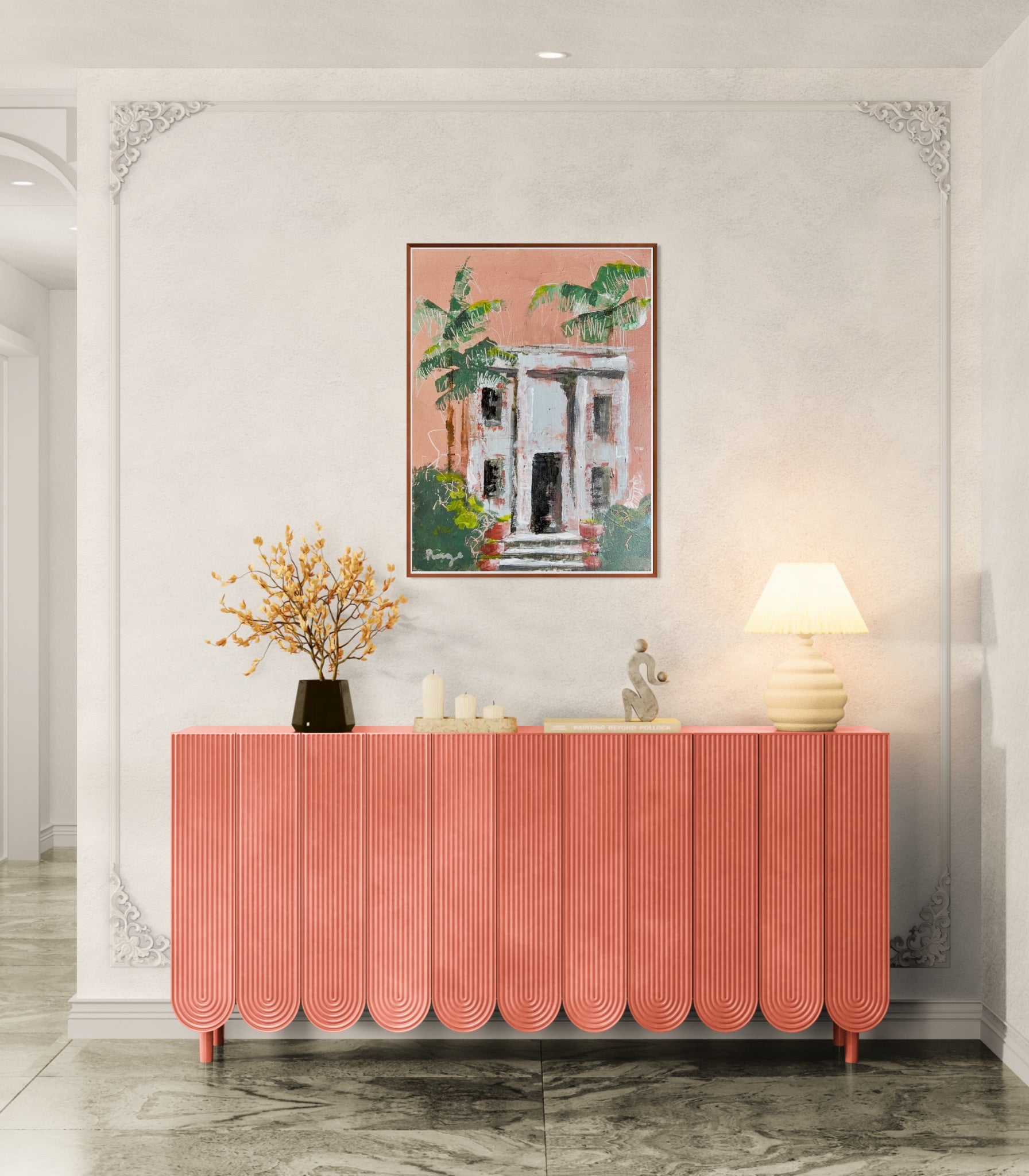 Inspired by sun-drenched façades and soft palm shadows, “Tropical” blends architectural calm with natural movement. Faded coral walls, olive greens, and warm neutrals create a nostalgic sense of place — like stepping into a tranquil coastal afternoon. This artwork brings a touch of tropical sophistication to any interior, from beach houses to urban sanctuaries.